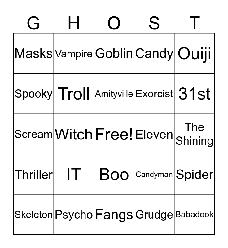 This bingo card has a free space and 72 words: Hocus Pocus, Vampire, Witch, Mummy, Soul, Haunted House, Candy, Voodoo Haunted, Exorcist, Poltergeist, Skeleton, Cemetary, 31st, Masks, Jack-O-Lantern, Scream, Candyman, Ouiji, Paranormal, The Shining, IT, Babadook, Spider, Frankenstein, Alien, Bat, Werewolf, Full Moon, Black Cat, Carrie, Psycho, Halloween, Zombie, Monster, Grudge, Redrum, Poison, Cauldron, Spooky, Costumes, Boo, Oogie Boogie, Beetlejuice, Coffin, Ghostbusters, Thriller, Supernatural, Freddy Krueger, Salem, Sleepy Hallow, Transylvania, Dracula, Bones, Eleven, Trick or Treat, Ghost, Goblin, Amityville, Roswell, Broomstick, Fire, Brimstone, Pumpkin, Fangs, Malificent, Casper, Troll, Gremlin, Goosebumps, Worm’s Wart, Web and Eye of Newt.