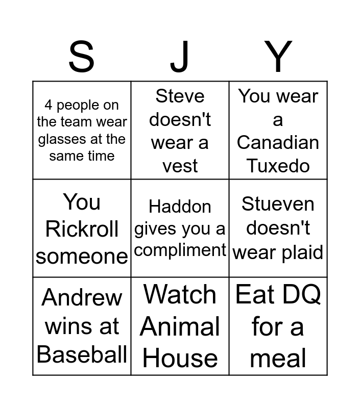 This bingo card has a free space and 11 words: Steve wears a sweater vest, Watch Animal House, Eat DQ for a meal, Andrew wins at Baseball, Steve doesn't wear a vest, You wear a Canadian Tuxedo, Stueven doesn't wear plaid, Danny doesn't catch the think fast ball, You Rickroll someone, 4 people on the team wear glasses at the same time and The client sends you an email with a smiley face.