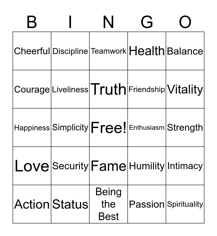 This bingo card has a free space and 24 words: Security, Status, Truth, Action, Balance, Cheerful, Courage, Discipline, Enthusiasm, Fame, Friendship, Happiness, Humility, Intimacy, Liveliness, Passion, Strength, Teamwork, Vitality, Simplicity, Spirituality, Love, Health and Being the Best.
