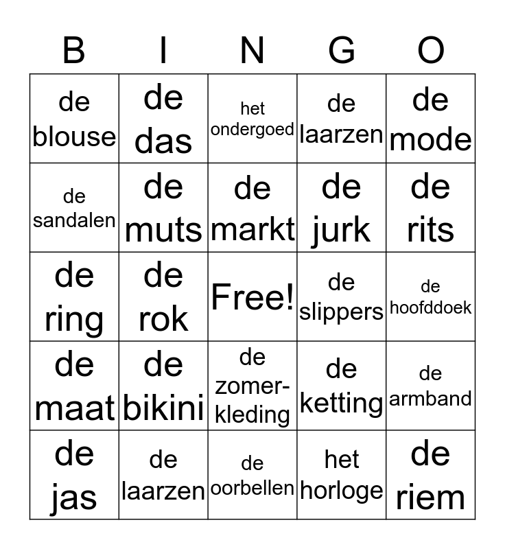 This bingo card has a free space and 29 words: de jas, de trui, de rok, dragen, de blouse, het ondergoed, de muts, de bikini, de slippers, de laarzen, de hoofddoek, de riem, de oorbellen, het horloge, de rits, de kleding- winkel, de zomer- kleding, de maat, de mode, de ring, de ketting, de veter, de jurk, de sandalen, de laarzen, de das, de armband, de markt and de broek.