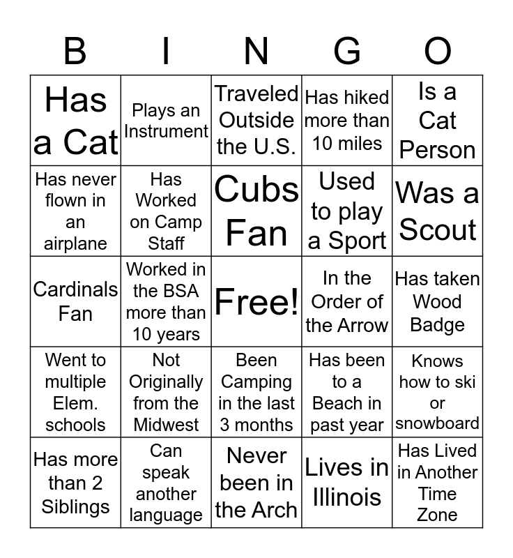 This bingo card has a free space and 34 words: Has 2 Dogs, Lives in Illinois, Has broken a bone before, Let's Go Blues!, Went to multiple Elem. schools, Has Worked on Camp Staff, Is a Cat Person, Has more than 2 Siblings, Plays an Instrument, Been to Philmont, Cubs Fan, Traveled Outside the U.S., Has Never Played Monopoly, Is Left-Handed, In the Order of the Arrow, Was a Scout, Can speak another language, Cardinals Fan, Not Originally from the Midwest, Has been to a Beach in past year, Been Camping in the last 3 months, Is an Eagle Scout, Has a Cat, Has taken Wood Badge, Never been in the Arch, Has Lived in Another Time Zone, Has hiked more than 10 miles, Never Ridden a horse, Used to play a Sport, Has never flown in an airplane, Doesn't Have Facebook, Worked in the BSA more than 10 years, Knows how to ski or snowboard and Grew up on a farm.