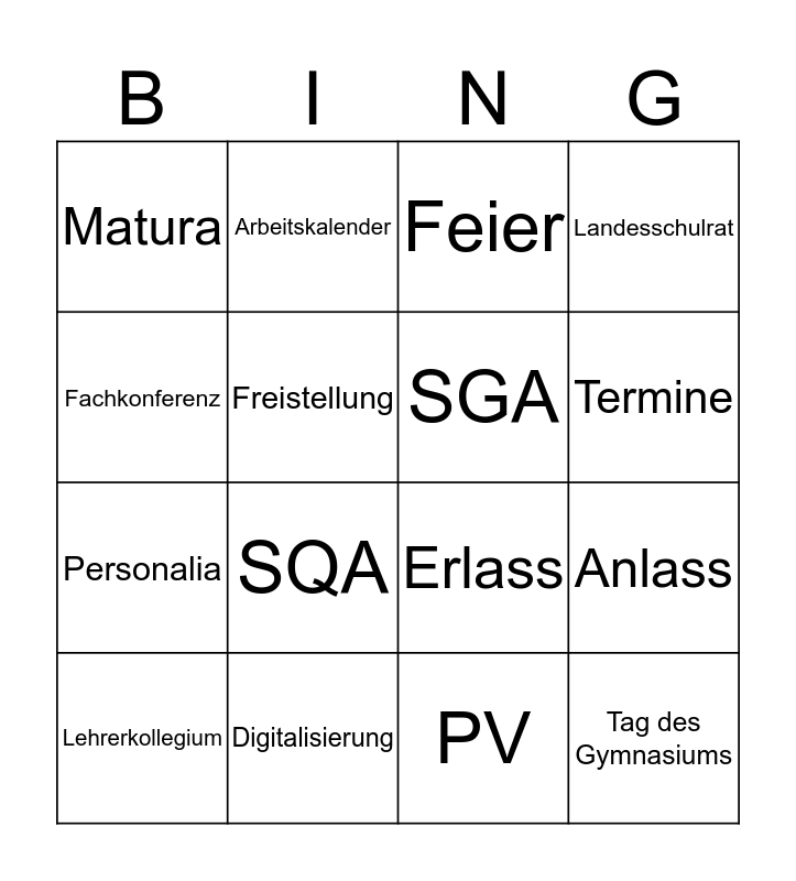 This bingo card has 47 words: Free!, SQA, NOST, Kompetenz, Schüler, Mobbing, SGA, Administration, Matura, Reifeprüfung, Erlass, Landesschulrat, Konferenz, Elternsprechtag, Elternabend, Elternverein, Fachkonferenz, Digitalisierung, Erste Hilfe, Termine, Personalia, Fachgruppen, Feier, Anlass, Antrag, Freistellung, webuntis, STG Melk Kalender, Sokrates, Pause, Haus, Abt, Konvent, Elternsprechtag, Tag der offenen Tür, Tag des Gymnasiums, Lehrerkollegium, KollegInnen, Schularbeiten, VWA, Arbeitsgruppen, Arbeitskalender, PV, Aushang, Inforaum, Kopierer and Sekretariat.
