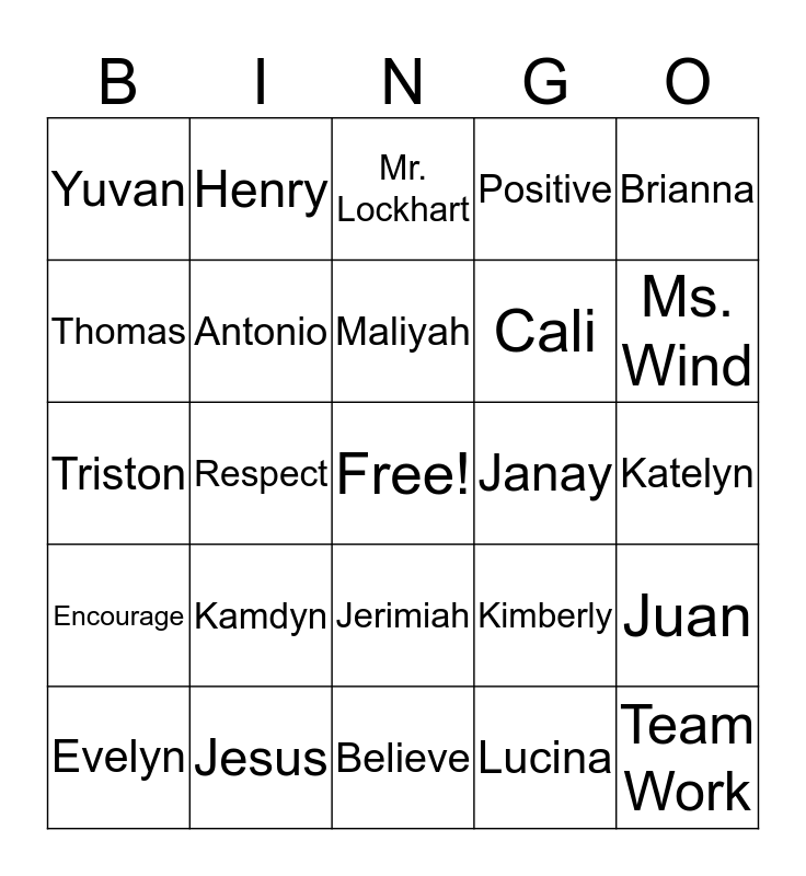 This bingo card has a free space and 24 words: Kamdyn, Jesus, Maliyah, Evelyn, Brianna, Yuvan, Thomas, Henry, Janay, Jerimiah, Cali, Triston, Kimberly, Juan, Antonio, Lucina, Katelyn, Mr. Lockhart, Ms. Wind, Respect, Team Work, Encourage, Positive and Believe.