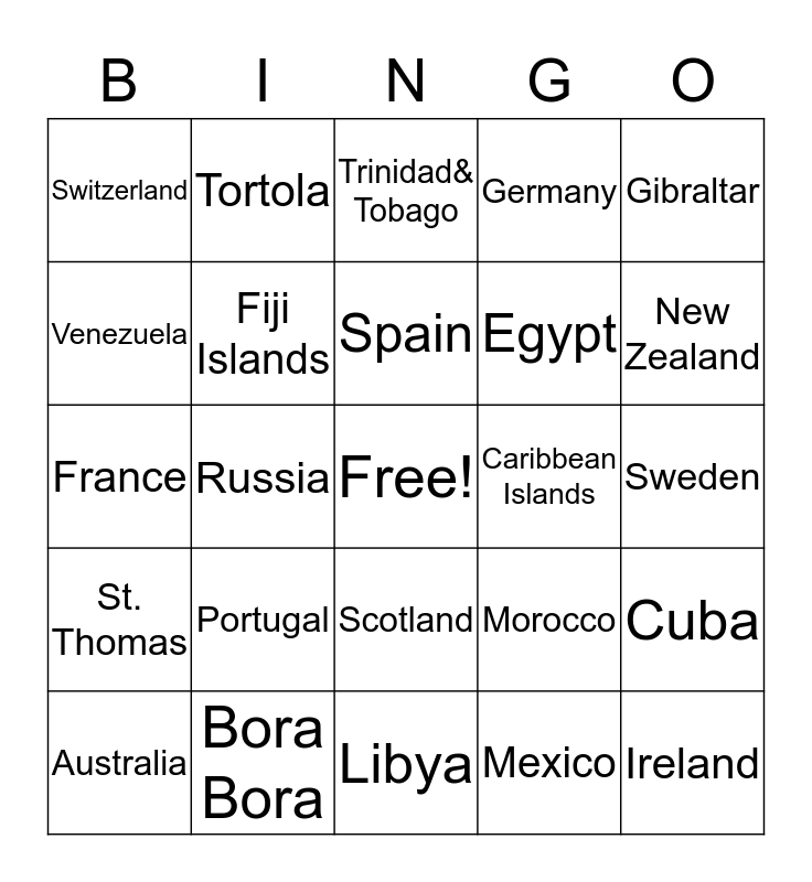 This bingo card has a free space and 27 words: Morocco, Greece, Egypt, Libya, Venezuela, Trinidad& Tobago, Tortola, St. Thomas, Caribbean Islands, Cuba, France, Germany, Australia, Bora Bora, New Zealand, Australia, Fiji Islands, Spain, Portugal, Switzerland, Sweden, Mexico, Russia, Ireland, Scotland, Gibraltar and Scandi-navia.