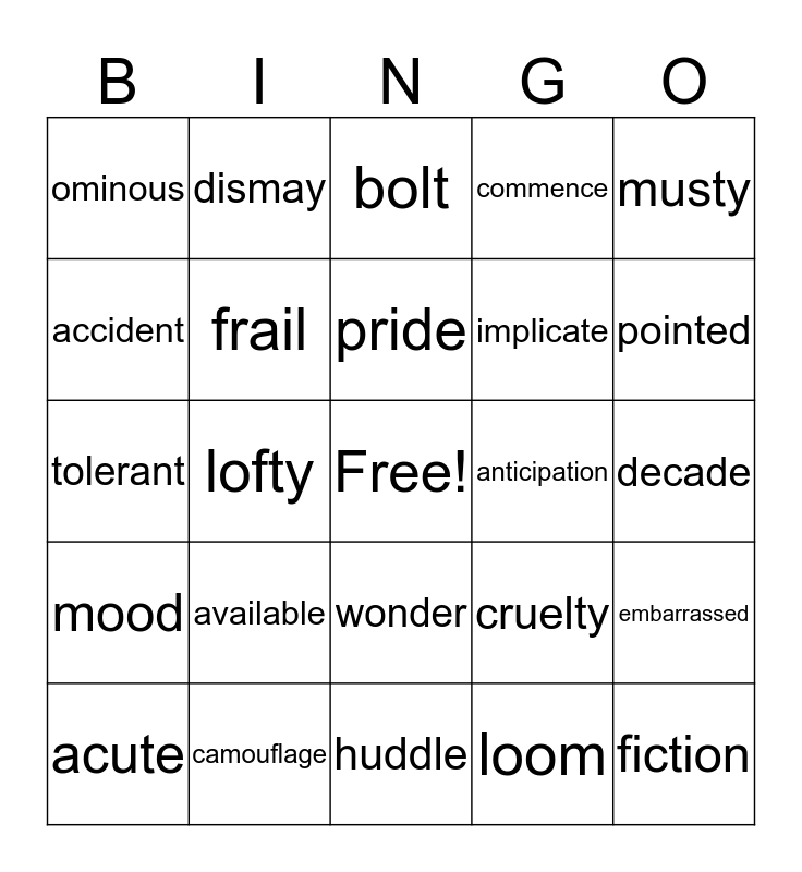 This bingo card has a free space and 29 words: acute, barren, lofty, temporal, ominous, bolt, frail, available, anticipation, camouflage, decade, fiction, huddle, loom, pointed, recognition, wonder, mood, musty, tolerant, cruelty, abandon, implicate, accident, commence, dismay, embarrassed, pride and theme.