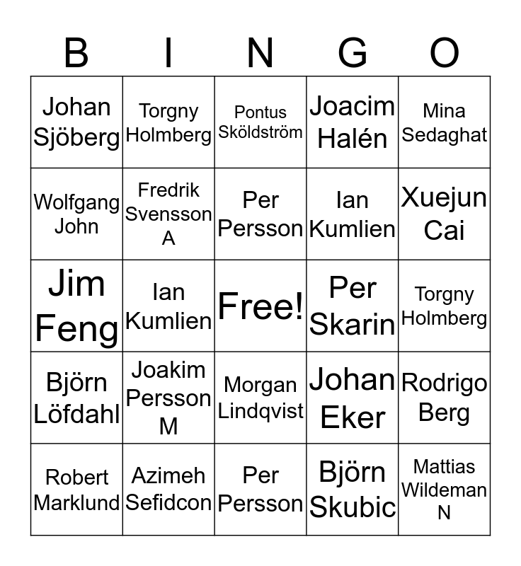 This bingo card has a free space and 58 words: Aleksandra Obeso Duque, Azimeh Sefidcon, Beatriz Grafulla, Björn Löfdahl, Björn Skubic, Daniel Turull, Fredrik Svensson A, Gemma Vall-llosera, Ian Kumlien, Jim Feng, Joacim Halén, Joakim Persson M, Joao Monteiro Soares, Johan Eker, Johan Olsson A, Johan Sjöberg, Mattias Wildeman N, Mina Sedaghat, Morgan Lindqvist, Per Persson, Per Skarin, Pontus Sköldström, Robert Marklund, Rodrigo Berg, Tomas Goldbeck-Löwe, Torgny Holmberg, Vinay Yadhav, Wolfgang John, Xuejun Cai, Aleksandra Obeso Duque, Azimeh Sefidcon, Beatriz Grafulla, Björn Löfdahl, Björn Skubic, Daniel Turull, Fredrik Svensson A, Gemma Vall-llosera, Ian Kumlien, Jim Feng, Joacim Halén, Joakim Persson M, Joao Monteiro Soares, Johan Eker, Johan Olsson A, Johan Sjöberg, Mattias Wildeman N, Mina Sedaghat, Morgan Lindqvist, Per Persson, Per Skarin, Pontus Sköldström, Robert Marklund, Rodrigo Berg, Tomas Goldbeck-Löwe, Torgny Holmberg, Vinay Yadhav, Wolfgang John and Xuejun Cai.