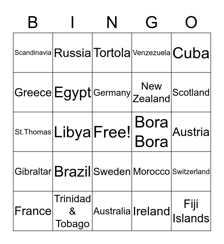 This bingo card has a free space and 24 words: Brazil, Trinidad & Tobago, Germany, France, Cuba, Scandinavia, Greece, Russia, Bora Bora, Sweden, New Zealand, St.Thomas, Morocco, Switzerland, Egypt, Ireland, Austria, Tortola, Scotland, Libya, Fiji Islands, Gibraltar, Venzezuela and Australia.