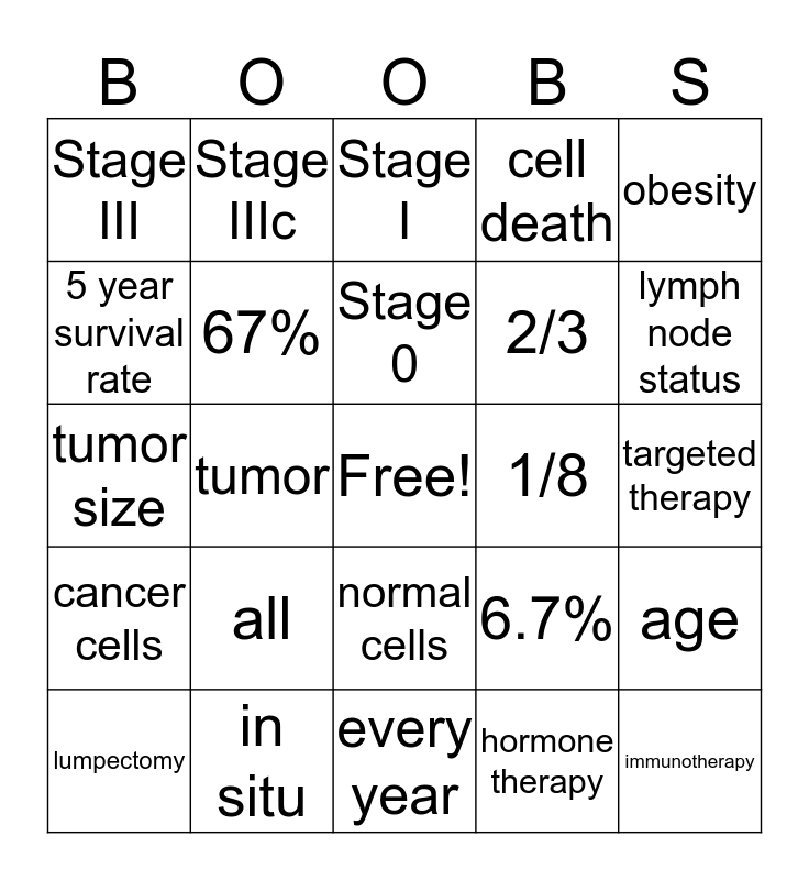 This bingo card has a free space and 31 words: every year, every month, tumor, malignant benign, Stage III, Stage I, 67%, 6.7%, 1/8, hormone therapy, targeted therapy, immunotherapy, mammogram, metasteses, lymph node status, swelling, age, all, cancer cells, normal cells, obesity, mastecomy, lumpectomy, Stage IIIc, 2/3, 5 year survival rate, cell death, tumor size, in situ, Stage 0 and Stage IV.