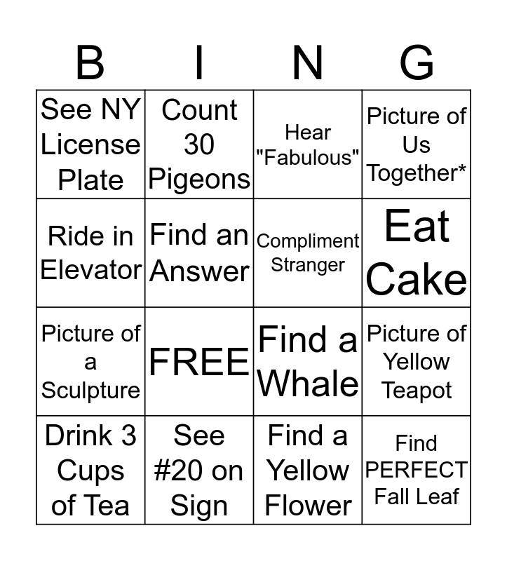This bingo card has 16 words: See #20 on Sign, Picture of Yellow Teapot, Hear "Fabulous", See NY License Plate, Picture of a Sculpture, Count 30 Pigeons, Find a Whale, Find a Yellow Flower, Ride in Elevator, Find an Answer, Drink 3 Cups of Tea, Picture of Us Together*, FREE, Eat Cake, Compliment Stranger and Find PERFECT Fall Leaf.
