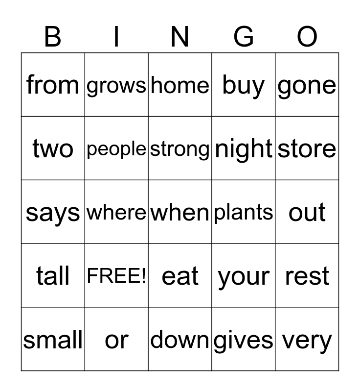 This bingo card has a free space and 24 words: FREE!, or, strong, small, gone, from, two, grows, plants, eat, night, says, your, rest, people, gives, out, home, store, where, very, tall, buy and down.