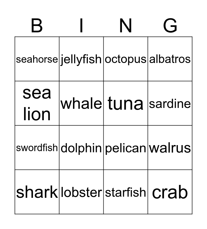 This bingo card has 16 words: lobster, walrus, octopus, seahorse, swordfish, jellyfish, pelican, starfish, sea lion, whale, shark, albatros, dolphin, sardine, tuna and crab.
