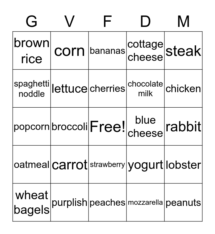 This bingo card has a free space and 24 words: wheat bagels, carrot, cherries, mozzarella, steak, brown rice, corn, bananas, blue cheese, rabbit, popcorn, lettuce, yogurt, lobster, spaghetti noddle, purplish, peaches, cottage cheese, chicken, oatmeal, broccoli, strawberry, chocolate milk and peanuts.