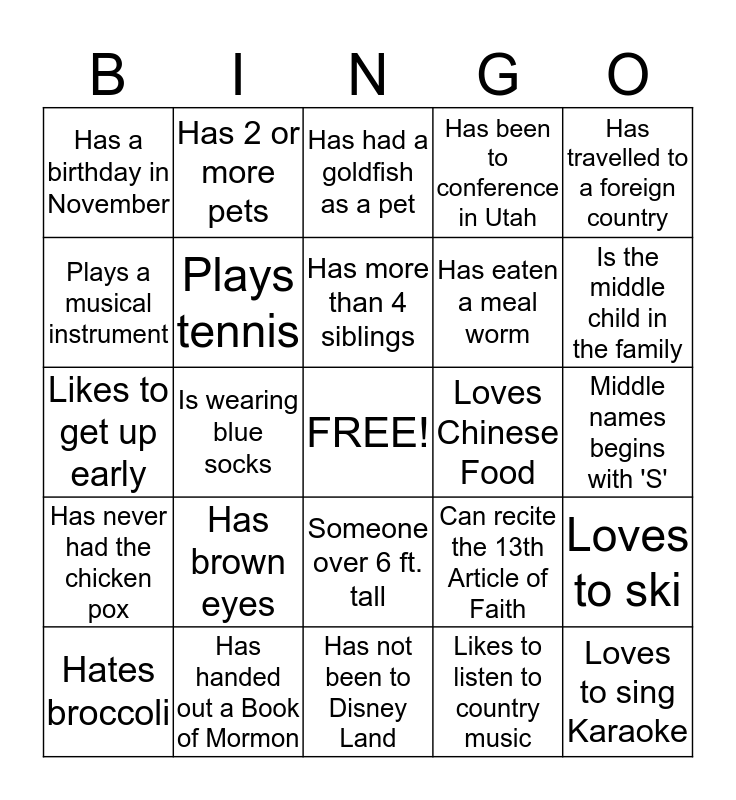 This bingo card has a free space and 24 words: Has brown eyes, Has handed out a Book of Mormon, Has more than 4 siblings, Hates broccoli, Has travelled to a foreign country, Has a birthday in November, Plays a musical instrument, Has 2 or more pets, Loves Chinese Food, Someone over 6 ft. tall, Has eaten a meal worm, Likes to get up early, Can recite the 13th Article of Faith, Loves to ski, Plays tennis, Likes to listen to country music, Middle names begins with 'S', Has had a goldfish as a pet, Is the middle child in the family, Is wearing blue socks, Loves to sing Karaoke, Has never had the chicken pox, Has been to conference in Utah and Has not been to Disney Land.
