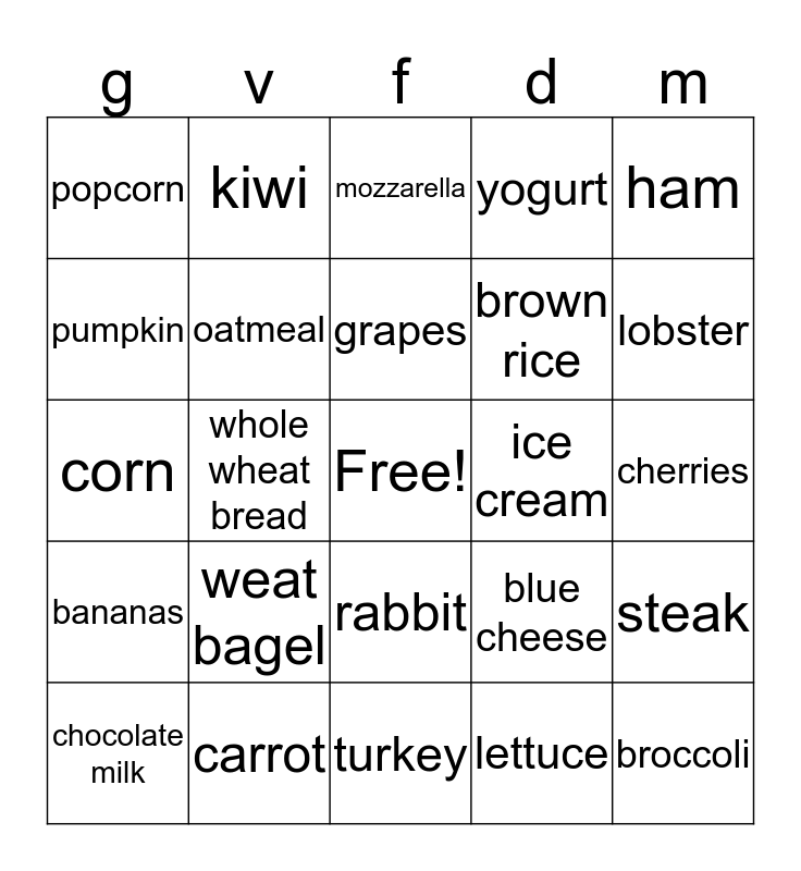 This bingo card has a free space and 24 words: weat bagel, carrot, grapes, chocolate milk, ham, popcorn, pumpkin, kiwi, ice cream, rabbit, brown rice, corn, blue cheese, steak, oatmeal, lettuce, cherries, mozzarella, lobster, whole wheat bread, broccoli, bananas, yogurt and turkey.