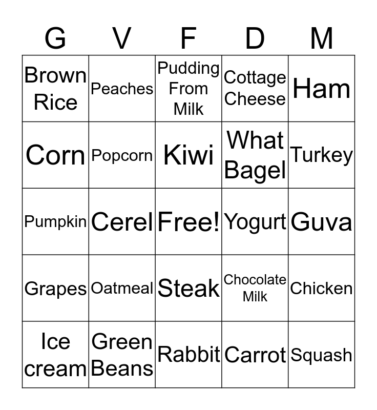 This bingo card has a free space and 24 words: Oatmeal, Green Beans, Kiwi, Ice cream, Ham, Brown Rice, Corn, Peaches, Yogurt, Steak, What Bagel, Pumpkin, Chocolate Milk, Chicken, Popcorn, Carrot, Guva, Pudding From Milk, Turkey, Cerel, Squash, Grapes, Cottage Cheese and Rabbit.