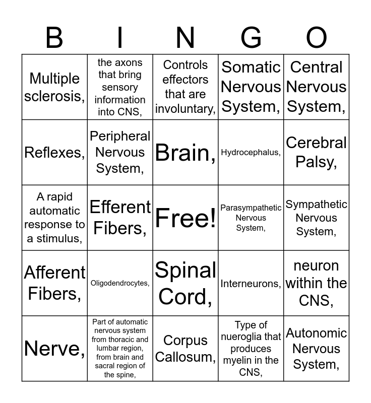 This bingo card has a free space and 39 words: Cerebrospinal Fluid,, Ventricles,, Meninges,, Peripheral Nervous System,, Nerve,, Spinal Cord,, Brain,, Plexuses,, Central Nervous System,, Afferent Fibers,, Efferent Fibers,, Somatic Nervous System,, Autonomic Nervous System,, Sympathetic Nervous System,, Parasympathetic Nervous System,, Oligodendrocytes,, Myelin,, Multiple sclerosis,, Ganglion,, Interneurons,, Reflexes,, Corpus Callosum,, Hydrocephalus,, Cerebral Palsy,, Fluid in the ventral course in the spine or the brain,, cavities such as a brain that contains cerebral spinal fluid,, three layers of membrane that cover the brain and spinal cord Parts of the nervous system outside of the brain and spinal cord bundle of axons in the peripheral(Nervous System),, network of interlaced nerves or blood vessels,, consist of the brain and spinal cord,, the axons that bring sensory information into CNS,, The axons that conduct impulses from CNS to effectors,, Controls skeletal Muscle,, Controls effectors that are involuntary,, Part of automatic nervous system from thoracic and lumbar region, from brain and sacral region of the spine,, Type of nueroglia that produces myelin in the CNS,, Lipid material forms a sheath like covering around some axons, disease which the immune system eats protective cover of nerves, mass of neuron cell bodies outside the nervous system,, neuron within the CNS,, A rapid automatic response to a stimulus, and a thick band of nerve fibers divide cerebral cortex to left/right A build up of fluid in the cavities deep within the brain, congenital disorder of movement%3BMuscle tone%3B and posture.