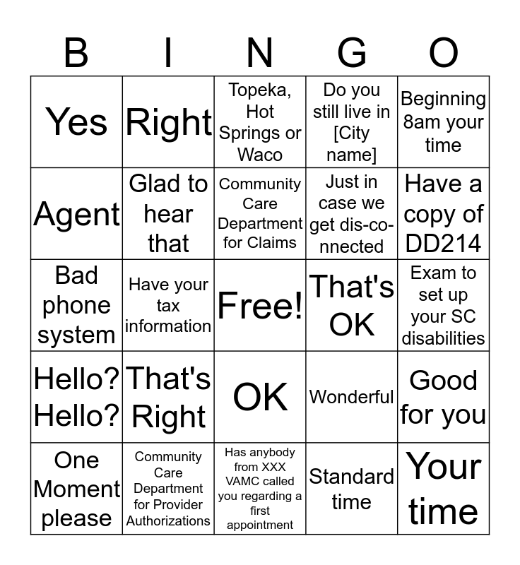 This bingo card has a free space and 24 words: That's Right, Community Care Department for Provider Authorizations, Community Care Department for Claims, One Moment please, Beginning 8am your time, Yes, Agent, Right, That's OK, OK, Just in case we get dis-co-nnected, Bad phone system, Wonderful, Good for you, Glad to hear that, Standard time, Exam to set up your SC disabilities, Topeka, Hot Springs or Waco, Have a copy of DD214, Have your tax information, Your time, Hello? Hello?, Do you still live in [City name] and Has anybody from XXX VAMC called you regarding a first appointment.