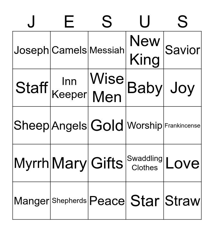This bingo card has a free space and 24 words: Mary, Shepherds, Wise Men, Manger, Savior, Joseph, Staff, Camels, Worship, Gifts, Baby, Sheep, Swaddling Clothes, Love, Inn Keeper, Star, Frankincense, Messiah, Joy, Angels, Straw, Myrrh, New King and Peace.