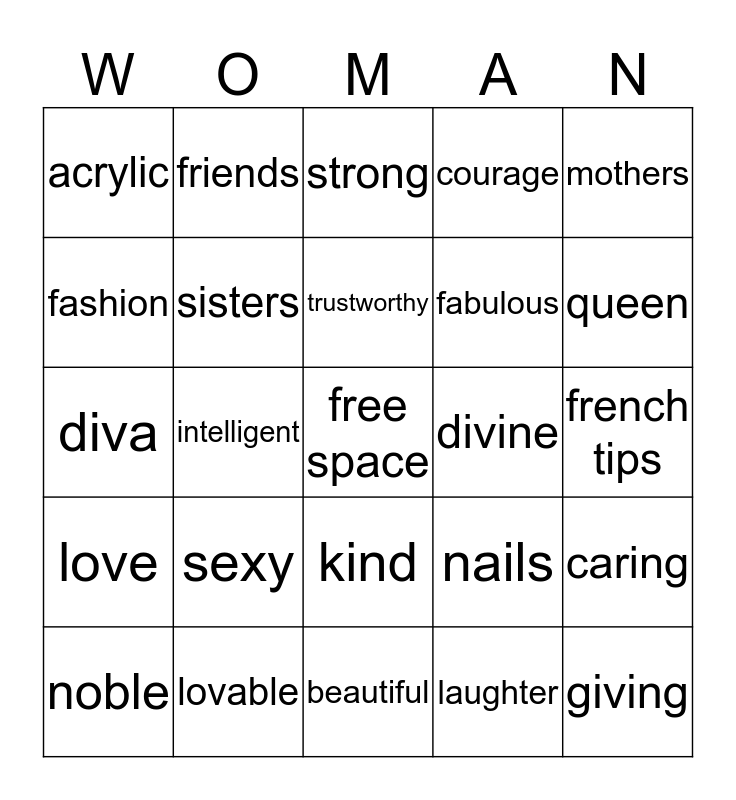 This bingo card has a free space and 24 words: sexy, lovable, trustworthy, noble, mothers, acrylic, fashion, friends, divine, kind, fabulous, diva, nails, caring, sisters, laughter, french tips, strong, queen, intelligent, giving, love, courage and beautiful.