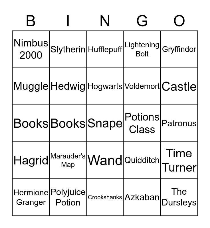 This bingo card has 39 words: Harry Potter, Scabbers, Ron Weasley, Hedwig, Hermione Granger, Wand, Hogwarts, Dumbledore, Gryffindor, Hagrid, Books, Lightening Bolt, Snape, Patronus, Potions Class, Marauder's Map, Chocolate Frogs, Nimbus 2000, Golden Snitch, Quidditch, Muggle, Crookshanks, Voldemort, Castle, Knight Bus, Dementors, The Dursleys, Flying Car, Ravenclaw, Slytherin, Malfoy, Dobby, Hufflepuff, Polyjuice Potion, Azkaban, Sirrius Black, Time Turner, Books and Owls.