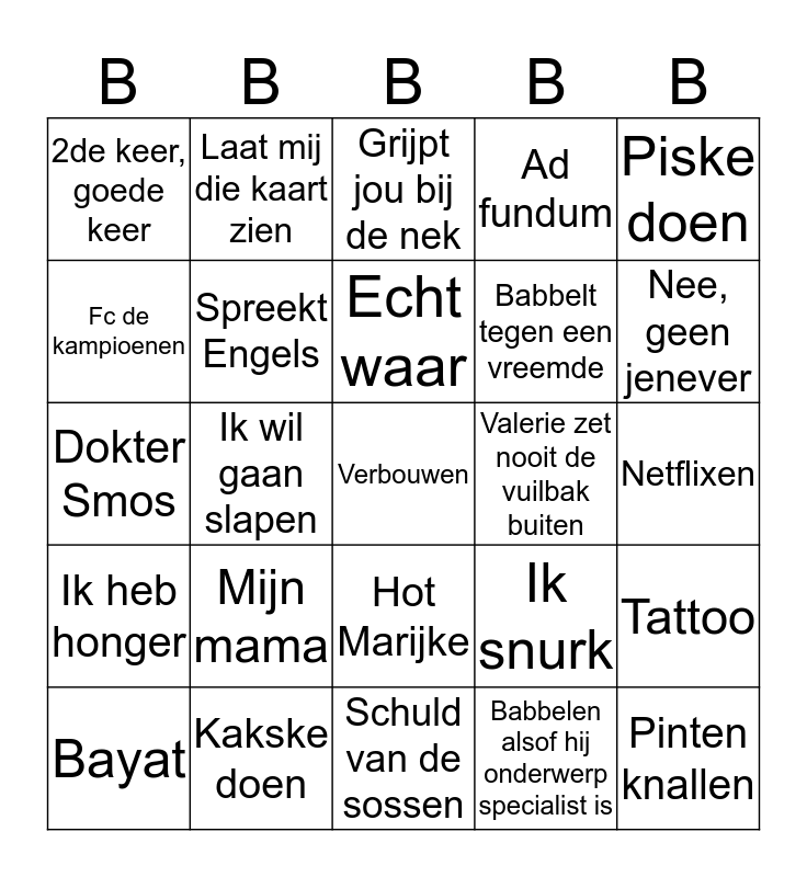 This bingo card has 45 words: Valerie, Verbouwen, Forza Ninove, Bayat, KVM, Babbelen alsof hij onderwerp specialist is, Grijpt jou bij de nek, Spontaan dansen ongeacht de locatie, Piske doen, Kakske doen, Ad fundum, Valerie zet nooit de vuilbak buiten, Hot Marijke, Mijn mama, Mijn papa, Schuld van de sossen, Doe mij maar ne cola, Dokter Smos, Struikelen, Nee, geen jenever, Laat mij die kaart zien, Nee, niet naar de stripclub, Ja, naar de stripclub, 2de keer, goede keer, Hollanders, Netflixen, Da mag ik thuis niet, Choco-mousse, Ik snurk, Ik heb honger, Geen foto's he, Tattoo, Ik wou geen weekend, Ik wou niet verkleed zijn, Ik wou geen opdrachten doen, Ik wil gaan slapen, Ik kan niet meer, Een watertje astublieft, Pinten knallen, Echt waar, Fc de kampioenen, Babbelt tegen een vreemde, Spreekt Frans, Spreekt Engels and Marc Coucke.