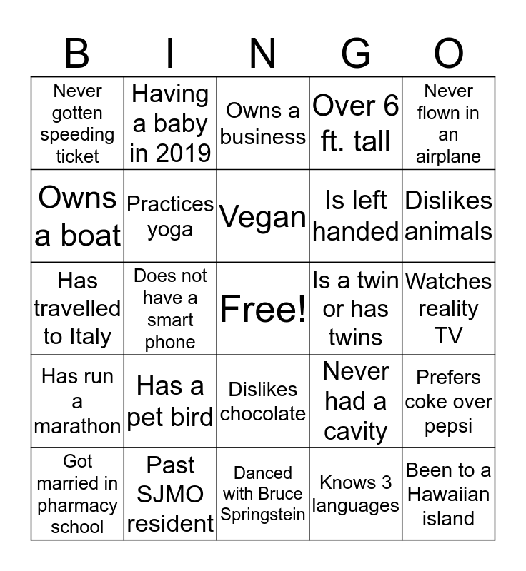 This bingo card has a free space and 24 words: Has a pet bird, Past SJMO resident, Vegan, Got married in pharmacy school, Never flown in an airplane, Never gotten speeding ticket, Owns a boat, Having a baby in 2019, Is a twin or has twins, Dislikes chocolate, Is left handed, Has travelled to Italy, Never had a cavity, Prefers coke over pepsi, Practices yoga, Knows 3 languages, Watches reality TV, Owns a business, Dislikes animals, Does not have a smart phone, Been to a Hawaiian island, Has run a marathon, Over 6 ft. tall and Danced with Bruce Springstein.