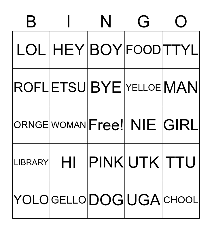 This bingo card has a free space and 24 words: HI, GELLO, BYE, YOLO, TTYL, LOL, ROFL, HEY, NIE, PINK, YELLOE, ORNGE, UTK, TTU, ETSU, UGA, GIRL, BOY, MAN, WOMAN, CHOOL, LIBRARY, FOOD and DOG.