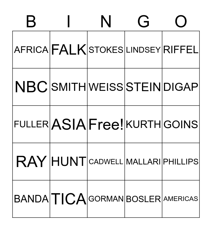 This bingo card has a free space and 29 words: BANDA, EUROPE, ASIA, EUROPE, AFRICA, STOKES, SMITH, HUNT, KURTH, TICA, GOINS, AMERICAS, GORMAN, BOSLER, DIGAP, DAMAZIO, CADWELL, RAY, RIFFEL, FULLER, MALLARI, SEALS, STEIN, NBC, LINDSEY, FALK, PHILLIPS, WEISS and LINDSEY.