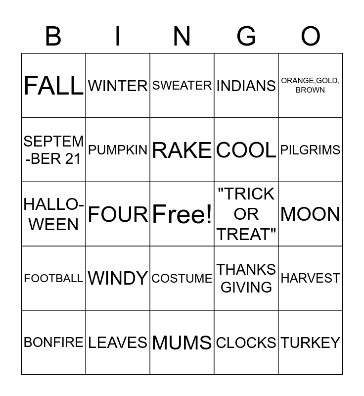 This bingo card has a free space and 24 words: WINDY, LEAVES, RAKE, BONFIRE, ORANGE,GOLD, BROWN, FALL, SEPTEM -BER 21, WINTER, "TRICK OR TREAT", COSTUME, COOL, HALLO- WEEN, THANKS GIVING, HARVEST, PUMPKIN, CLOCKS, MOON, SWEATER, PILGRIMS, FOUR, TURKEY, FOOTBALL, INDIANS and MUMS.
