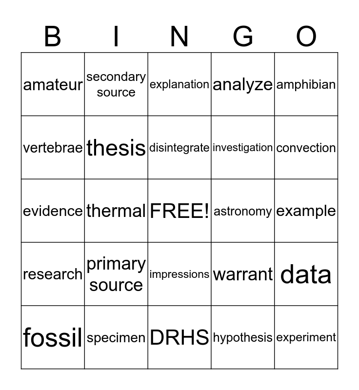 This bingo card has a free space and 24 words: primary source, specimen, disintegrate, fossil, amphibian, amateur, vertebrae, secondary source, astronomy, impressions, investigation, evidence, warrant, data, thesis, hypothesis, example, explanation, convection, thermal, experiment, research, analyze and DRHS.