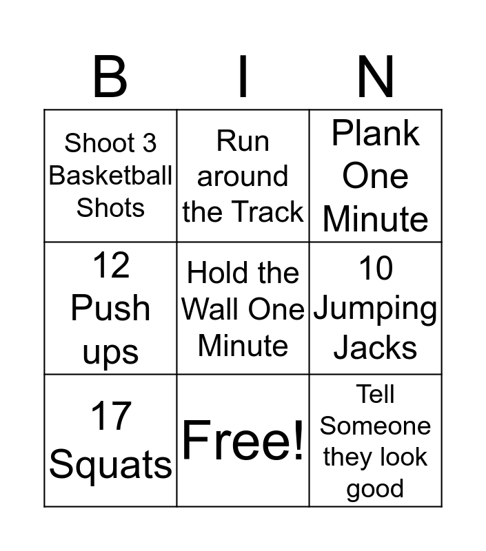 This bingo card has a free space and 8 words: 10 Jumping Jacks, Plank One Minute, Run around the Track, 17 Squats, Shoot 3 Basketball Shots, Tell Someone they look good, 12 Push ups and Free!.