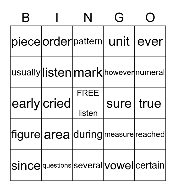 This bingo card has a free space and 24 words: area, questions, mark, since, ever, piece, usually, order, sure, during, however, early, measure, reached, listen, vowel, true, pattern, numeral, cried, certain, figure, unit and several.