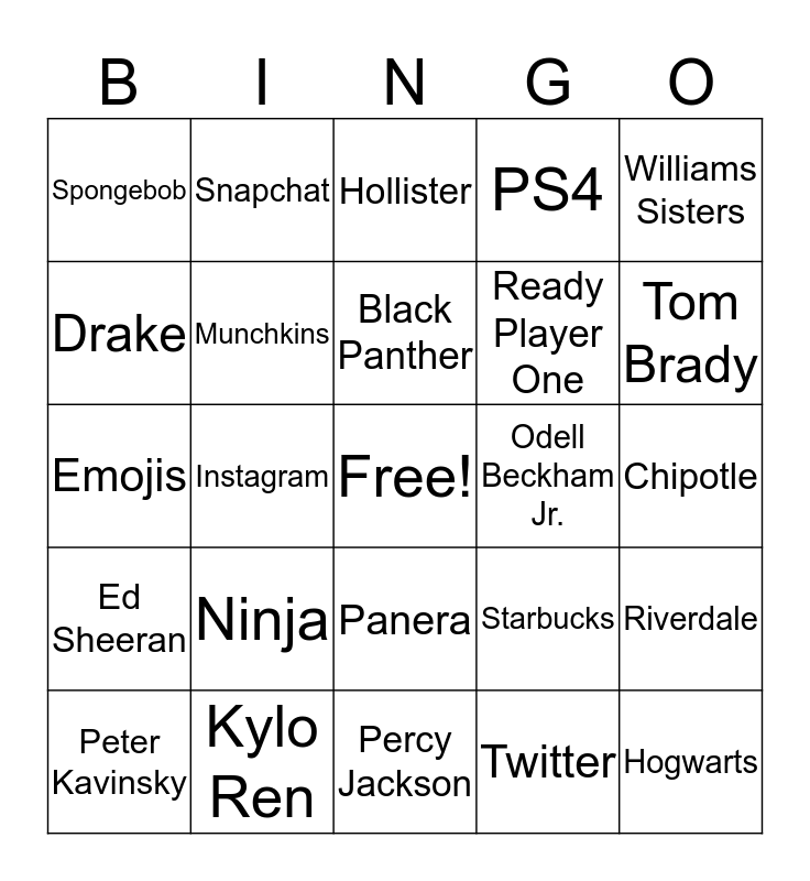 This bingo card has a free space and 25 words: Ninja, Percy Jackson, Black Panther, Peter Kavinsky, Williams Sisters, Spongebob, Drake, Snapchat, Odell Beckham Jr., Panera, Ready Player One, Emojis, Starbucks, Riverdale, Munchkins, The Hunger Games, Chipotle, Hollister, Tom Brady, Instagram, Hogwarts, Kylo Ren, Ed Sheeran, PS4 and Twitter.