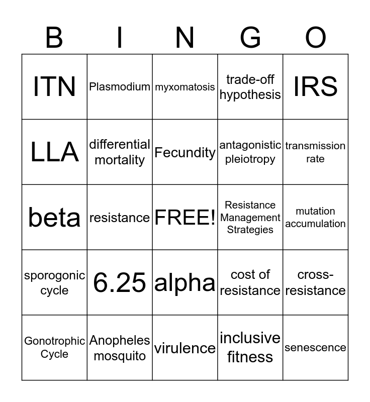 This bingo card has a free space and 24 words: 6.25, Anopheles mosquito, Fecundity, Gonotrophic Cycle, IRS, ITN, LLA, Plasmodium, Resistance Management Strategies, alpha, antagonistic pleiotropy, beta, cost of resistance, cross-resistance, differential mortality, inclusive fitness, mutation accumulation, myxomatosis, transmission rate, resistance, senescence, sporogonic cycle, trade-off hypothesis and virulence.