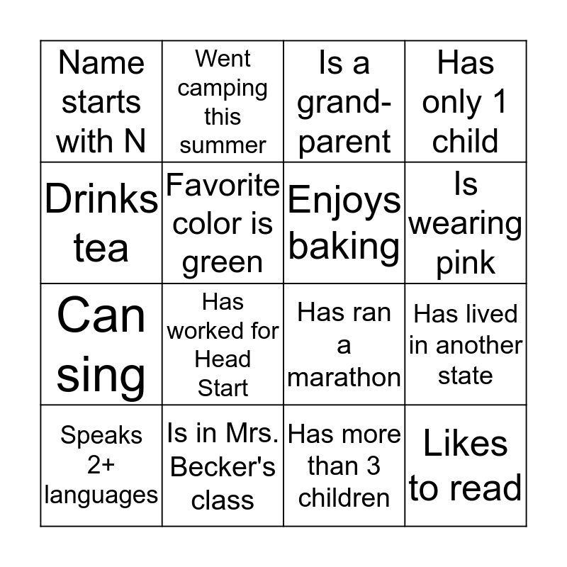 This bingo card has 24 words: Has Maura as an advocate, Has a pet, Is wearing pink, Has brown eyes, Drinks tea, Name starts with N, Favorite color is green, Went camping this summer, Is in Mrs. Becker's class, Plays piano, Can sing, Has ran a marathon, Has always lived in WI, Loves winter, Enjoys baking, Has a vegetable garden, Has more than 3 children, Is a grand- parent, Has worked for Head Start, Has lived in another state, Speaks 2+ languages, Likes to read, Has only 1 child and Is less than 5 ft. tall.