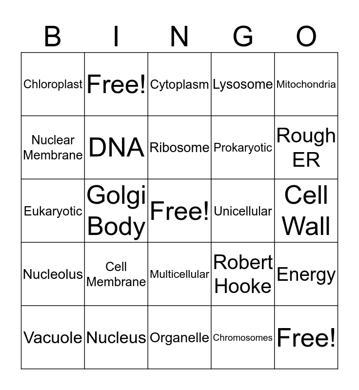 This bingo card has a free space and 24 words: Cell Membrane, Nucleus, Ribosome, Vacuole, Mitochondria, Chloroplast, Nuclear Membrane, Free!, Unicellular, Multicellular, Prokaryotic, Eukaryotic, Robert Hooke, Energy, DNA, Chromosomes, Cell Wall, Cytoplasm, Rough ER, Golgi Body, Free!, Nucleolus, Lysosome and Organelle.