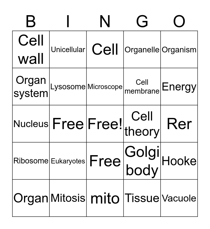 This bingo card has a free space and 24 words: Eukaryotes, Mitosis, Microscope, Organ, Organism, Cell wall, Organ system, Unicellular, Cell theory, Free, Cell membrane, Nucleus, Golgi body, Hooke, Lysosome, Tissue, Rer, Cell, Energy, Free, Vacuole, Ribosome, Organelle and mito.