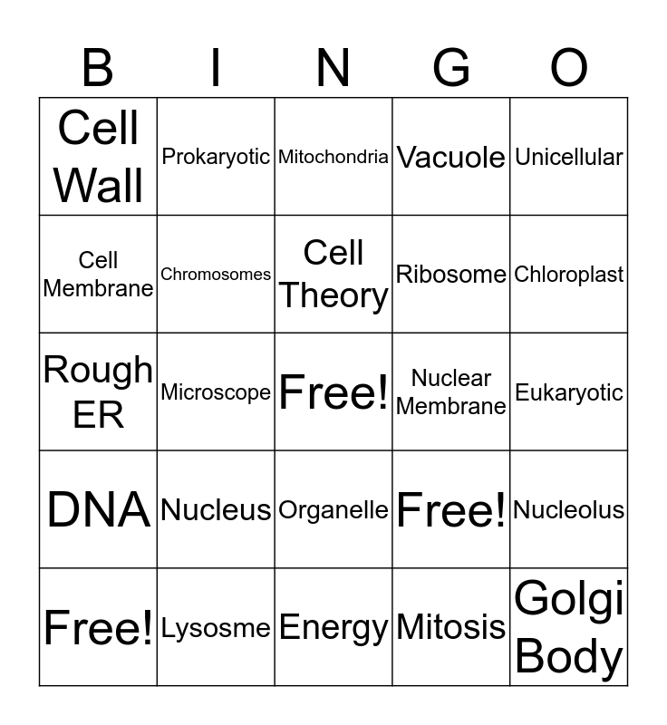 This bingo card has 25 words: Nucleus, Energy, Cell Theory, Free!, Unicellular, Cell Wall, Cell Membrane, Prokaryotic, Nuclear Membrane, Organelle, Ribosome, Rough ER, Free!, Nucleolus, Chromosomes, Golgi Body, Eukaryotic, Mitochondria, Chloroplast, Microscope, Free!, Lysosme, DNA, Vacuole and Mitosis.