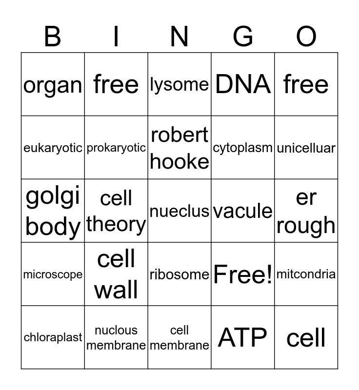 This bingo card has 25 words: cell wall, cell membrane, robert hooke, chloraplast, free, organ, eukaryotic, free, vacule, ribosome, cytoplasm, golgi body, Free!, mitcondria, prokaryotic, cell, er rough, lysome, unicelluar, cell theory, nueclus, nuclous membrane, microscope, DNA and ATP.