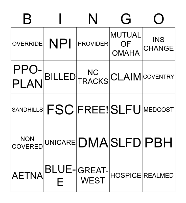 This bingo card has a free space and 95 words: MAILBOX, 7090, HOSPICE, NOT FOUND, SEARCH, SUBSCRIBER, GE, BLUE-E, OPTIMA, OXFORD, NATIONWIDE, HEALTH CHOICE, CAROLINA ACCESS, NC TRACKS, PASSPORT, OVERRIDE, COVENTRY, CORESOURCE, ADDRESS, DOS, DOB, COVENTRY, ALLSTATE, DIALYSIS, MUTUAL OF OMAHA, PPO-PLAN, SUPPLEMENT, CLAIM, NORTH CAROLINA, MAGELLAN, UNICARE, CIGNA, MRN, TAX ID, AETNA, WELLPATH, GREAT-WEST, UNITED HEALTHCARE, SANDHILLS, ALLIANCE, PBH, FSC, DMA, INS CHANGE, SLFD, SLFU, LME, PATIENT, SOVERA, CT VISION, YPYW, CO-PAYMENT, 4022, AARP, UNINSURED, HUNTER, SIMMONS, BLUE, CODE, MEMBER, BILLED, PREVIEW, VISIT LIST, YPZW, COB, PRIMARY, MENTAL HEALTH, PALMETTO, PROVIDER, MEDICAID, MEDICARE, EMAILS, REALMED, REJECTIONS, MILLNER, WEATHERS, PHONE CALLS, PENDING M'CAID, TES EDITS, NPI, PART A, PART B, PIEDMONT, BCBS, MEDCOST, NON COVERED, TRICARE, AETNA, SUBSCRIBER, COPY, SELECT ALL, PRINT, PASTE, MAYS and BLUE-E.