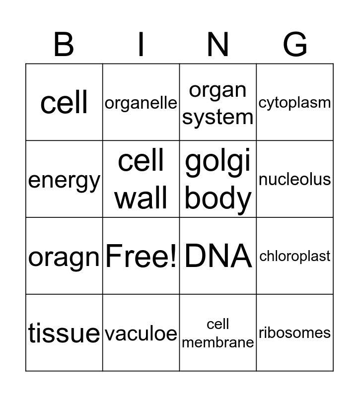 This bingo card has 16 words: vaculoe, chloroplast, organ system, cell, oragn, organelle, DNA, cell membrane, energy, cell wall, tissue, cytoplasm, Free!, nucleolus, golgi body and ribosomes.