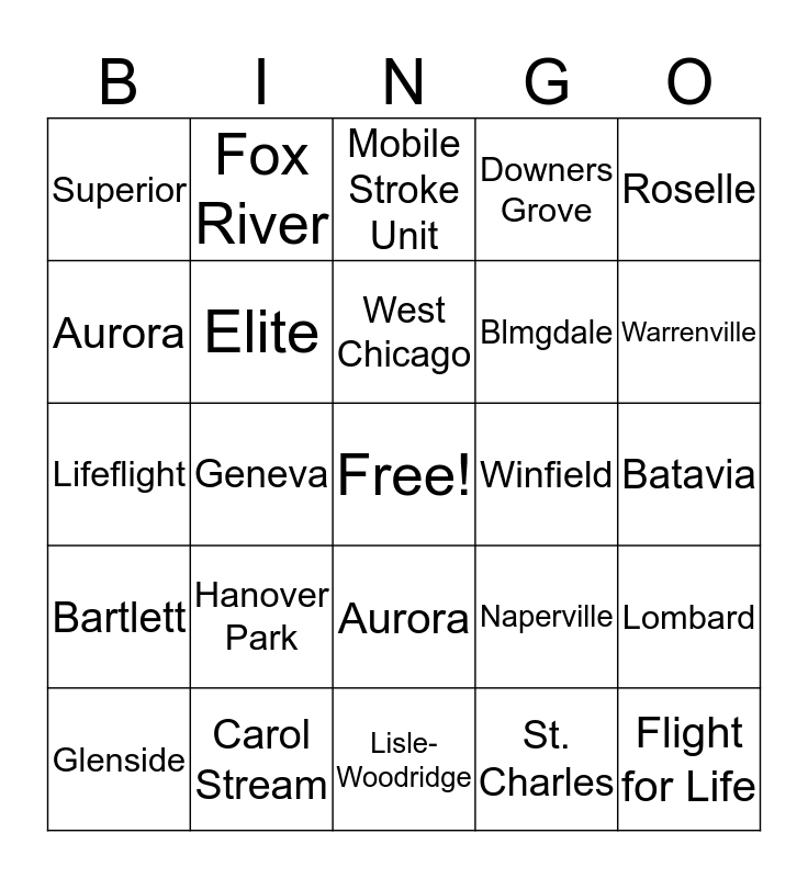 This bingo card has a free space and 29 words: Wheaton, Carol Stream, Mobile Stroke Unit, Glen Ellyn, Roselle, Superior, Elite, West Chicago, Winfield, Lombard, Glenside, Geneva, St. Charles, Flight for Life, Lifeflight, Lifestar, Lisle-Woodridge, Naperville, Warrenville, Bartlett, Hanover Park, Addison, Blmgdale, Batavia, Aurora, Fox River, Aurora, Downers Grove and Streamwoos.