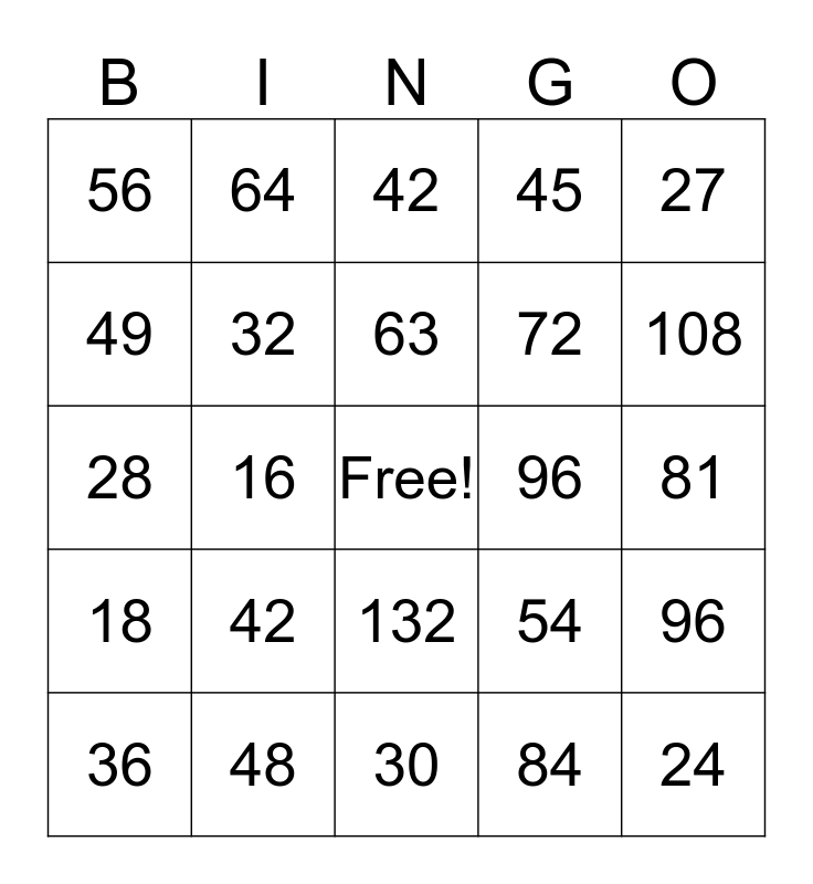 This bingo card has a free space and 24 words: 42, 48, 63, 36, 27, 56, 49, 64, 96, 132, 72, 28, 54, 96, 32, 84, 81, 42, 108, 16, 24, 18, 45 and 30.