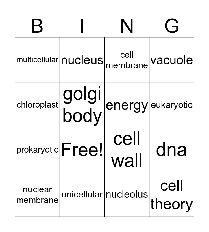 This bingo card has 16 words: unicellular, dna, cell membrane, multicellular, prokaryotic, nucleus, cell wall, nucleolus, chloroplast, golgi body, nuclear membrane, vacuole, Free!, eukaryotic, energy and cell theory.