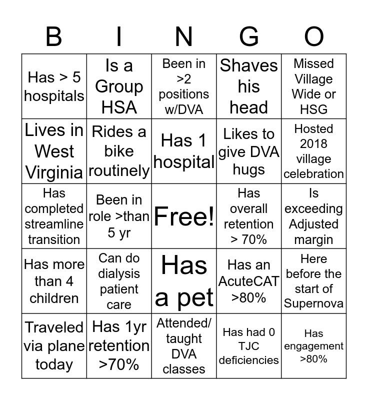 This bingo card has a free space and 29 words: Traveled via plane today, Had a baby in the last 12 mo., Been in role >than 5 yr, Received a core value award, Has > 5 hospitals, Been in >2 positions w/DVA, Rides a bike routinely, Can do dialysis patient care, Has overall retention > 70%, Has 1yr retention >70%, Is exceeding Adjusted margin, Has engagement >80%, Attended/ taught DVA classes, Has had 0 TJC deficiencies, Hosted 2018 village celebration, Has an acute-dedicated BSS, Has a pet, Has more than 4 children, Missed Village Wide or HSG, Has completed streamline transition, Has an AcuteCAT >80%, Is wearing DVA blue or yellow, Likes to give DVA hugs, Lives in West Virginia, Shaves his head, Is a Group HSA, Here before the start of Supernova, Has 1 hospital and Has a DNV/HFAP hospital.