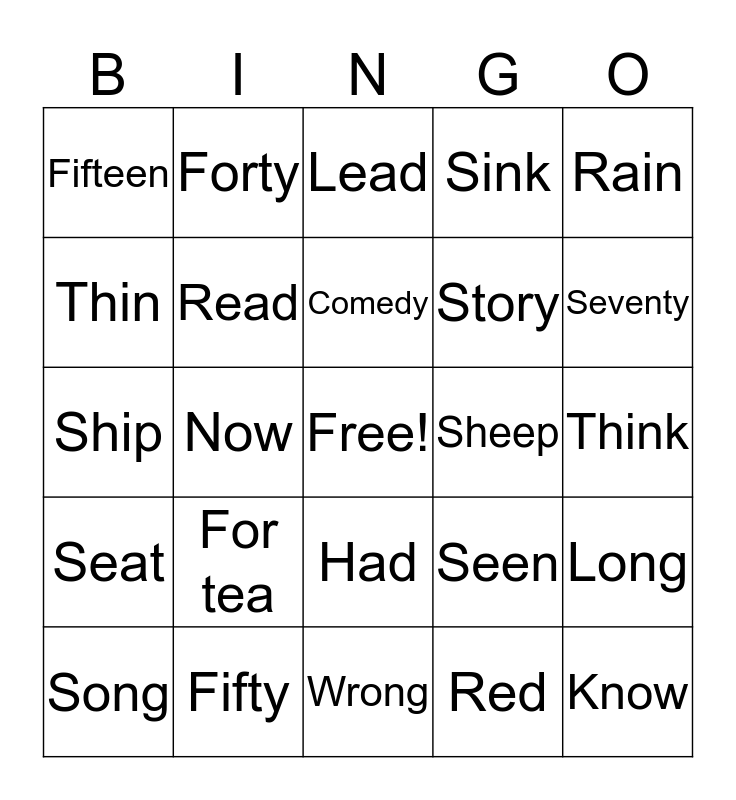 This bingo card has a free space and 25 words: For tea, Wrong, Comedy, Song, Rain, Fifteen, Thin, Forty, Sheep, Had, Story, Ship, Seen, Long, Read, Seventeen, Think, Lead, Seventy, Now, Know, Fifty, Seat, Sink and Red.