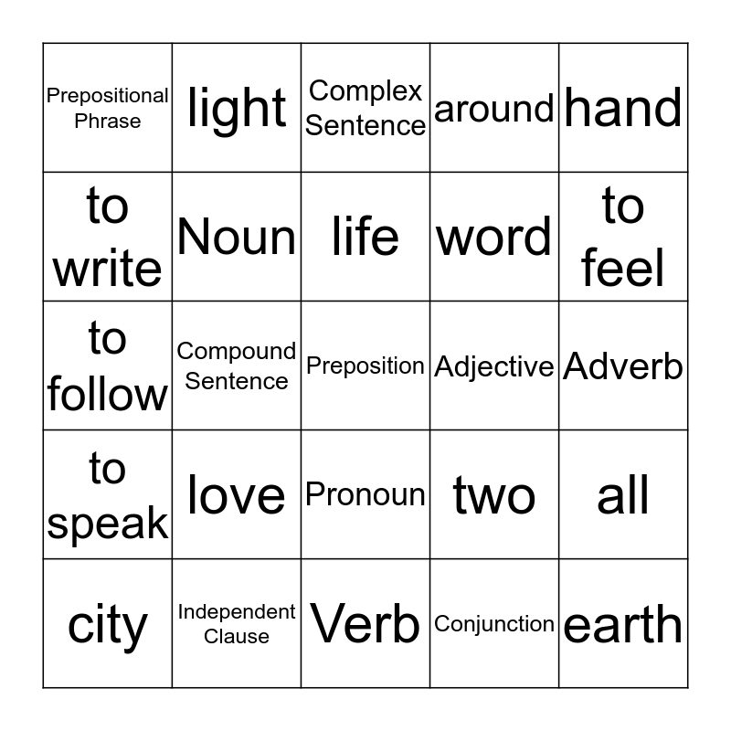 This bingo card has 30 words: Independent Clause, Dependent Clause, Compound Sentence, Coordinating Conjunctions, Prepositional Phrase, Complex Sentence, Noun, Pronoun, Adjective, Verb, Adverb, Preposition, Conjunction, earth, to feel, one, two, to speak, love, hand, to follow, to write, light, word, to write, around, all, city, life and study of.