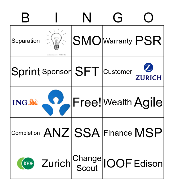 This bingo card has 5 images, a free space and 19 words: ANZ, Zurich, SFT, PSR, Separation, Sprint, Wealth, SSA, Customer, Finance, MSP, Sponsor, IOOF, Agile, SMO, Edison, Completion, Warranty and Change Scout.