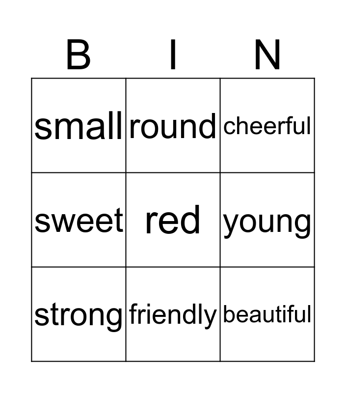 This bingo card has 9 words: strong, red, cheerful, small, round, young, sweet, friendly and beautiful.