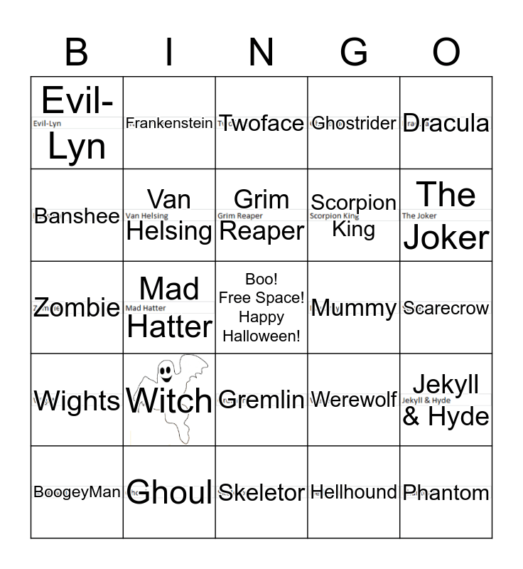 This bingo card has 24 images, a free space and 24 words: Witch, Ghoul, Grim Reaper, BoogeyMan, Dracula, Evil-Lyn, Banshee, Frankenstein, Mummy, Gremlin, Scorpion King, Zombie, Werewolf, Jekyll & Hyde, Van Helsing, Hellhound, Scarecrow, Twoface, The Joker, Mad Hatter, Phantom, Wights, Ghostrider and Skeletor.